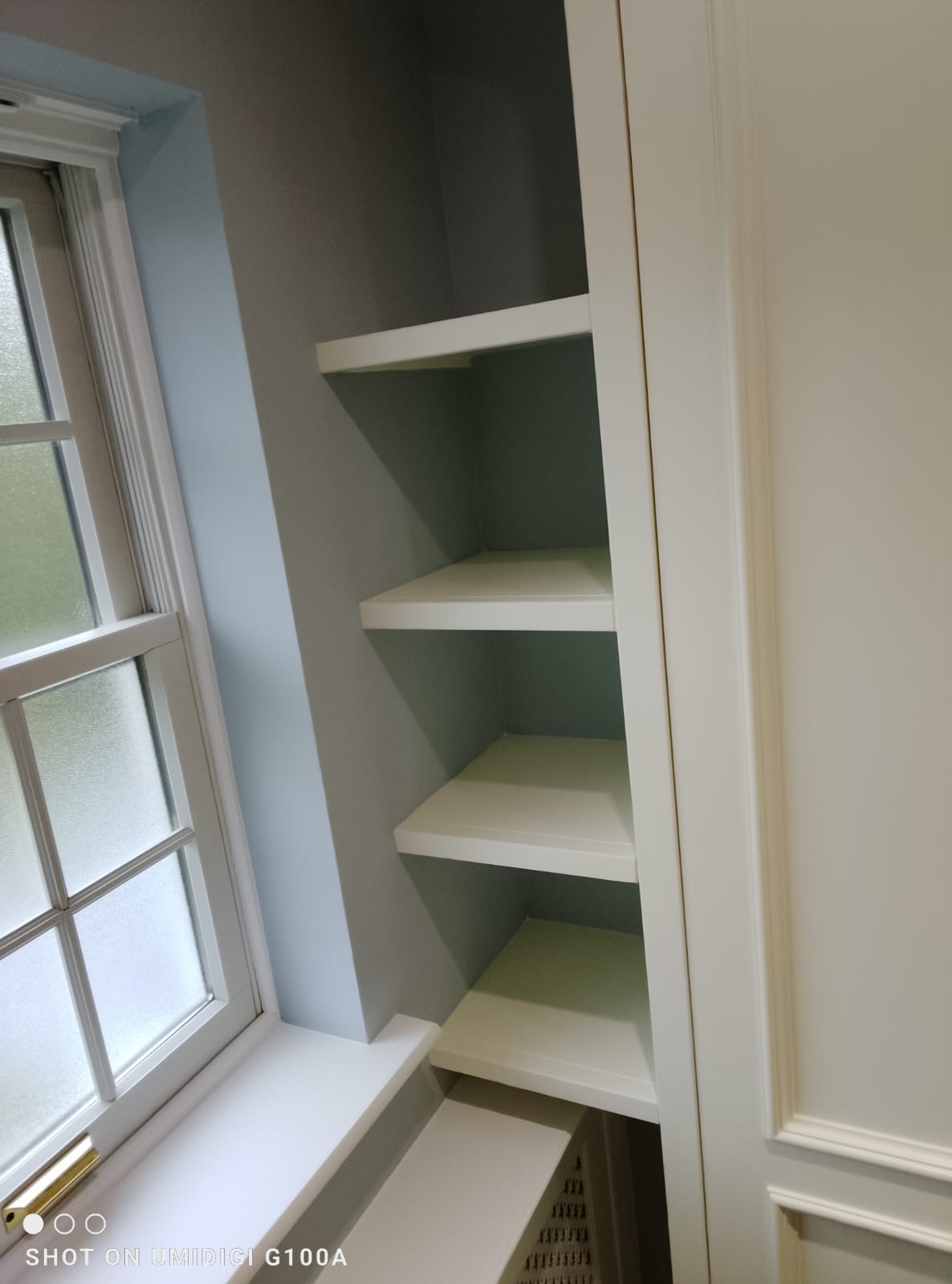 Finally, we turned our attention to the woodwork, finishing it in Renner products mixed to match Little Greene’s ‘First Light’. This combination gives a beautifully soft tone and exceptional resilience — the same high-quality finish we use on bespoke kitchens and cabinetry for a refined, lasting result.